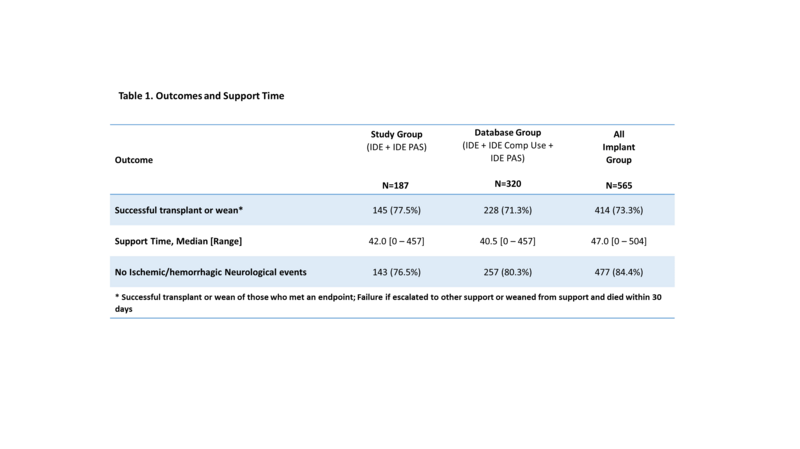 The subjects in the All implant group were supported for a median of 47 days (range 0-504) and were successfully weaned or bridged to transplant in 73% of the subjects. The rate of ischemic/hemorrhagic events experienced decreased over the years and was only 15.6% in the overall group.
